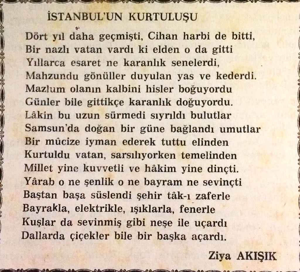 İstanbullu şair Ziya bey’in İstanbul’un kurtuluşu üzerine kaleme aldığı dizeler… Afrin operasyonunun başarıyla tamamlandığı ve terör tehdidinin sınırlarımızdan uzaklaştırıldığı bu günlerde daha anlamlı olan bu kurtuluş şiiri ve Ziya Bey’in kaleminden aynı mutluluğun farklı zaman dilimlerindeki tezahürüne şahitlik edelim…