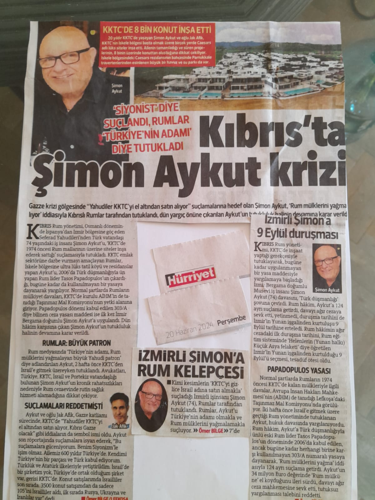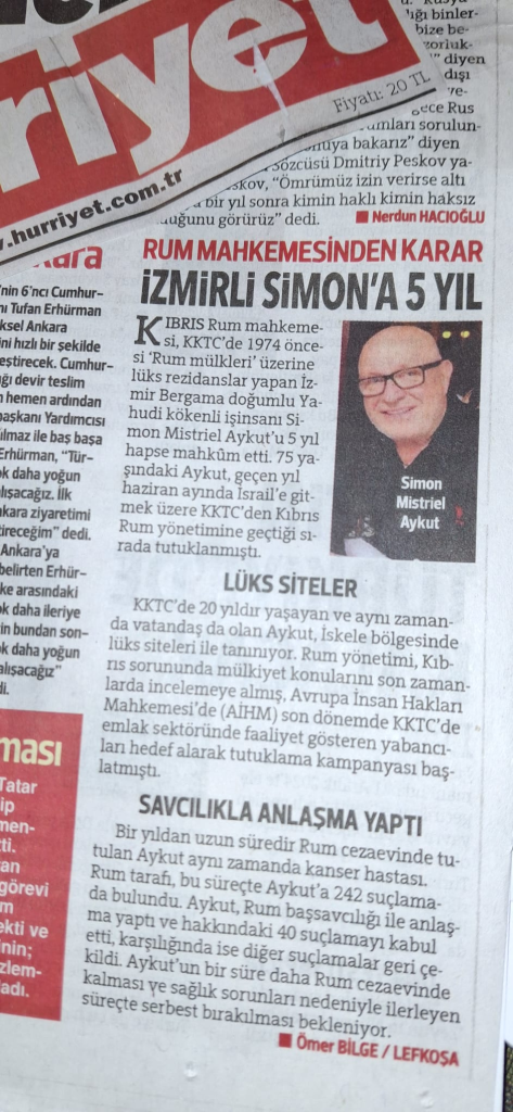 İskele’deki Caesar Resort yatırımı ile tanınan ve Kıbrıs Rum mallarını gasp ettiği gerekçesiyle 7 Haziran’da Güney Kıbrıs’ta tutuklu bulunan Afik Group şirketlerinin CEO’su Simon Mistriel Aykut hakkında dün Lefkoşa Rum Kaza Mahkemesi tarafından dava dosyalandığı belirtildi. DEVAMI İÇİN TIKLAYIN